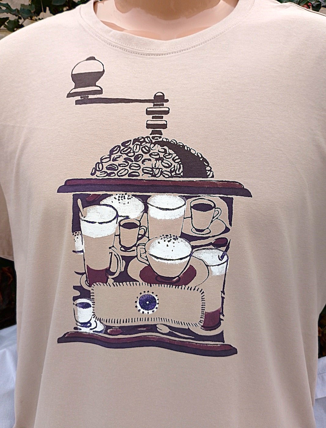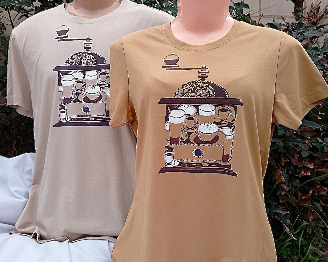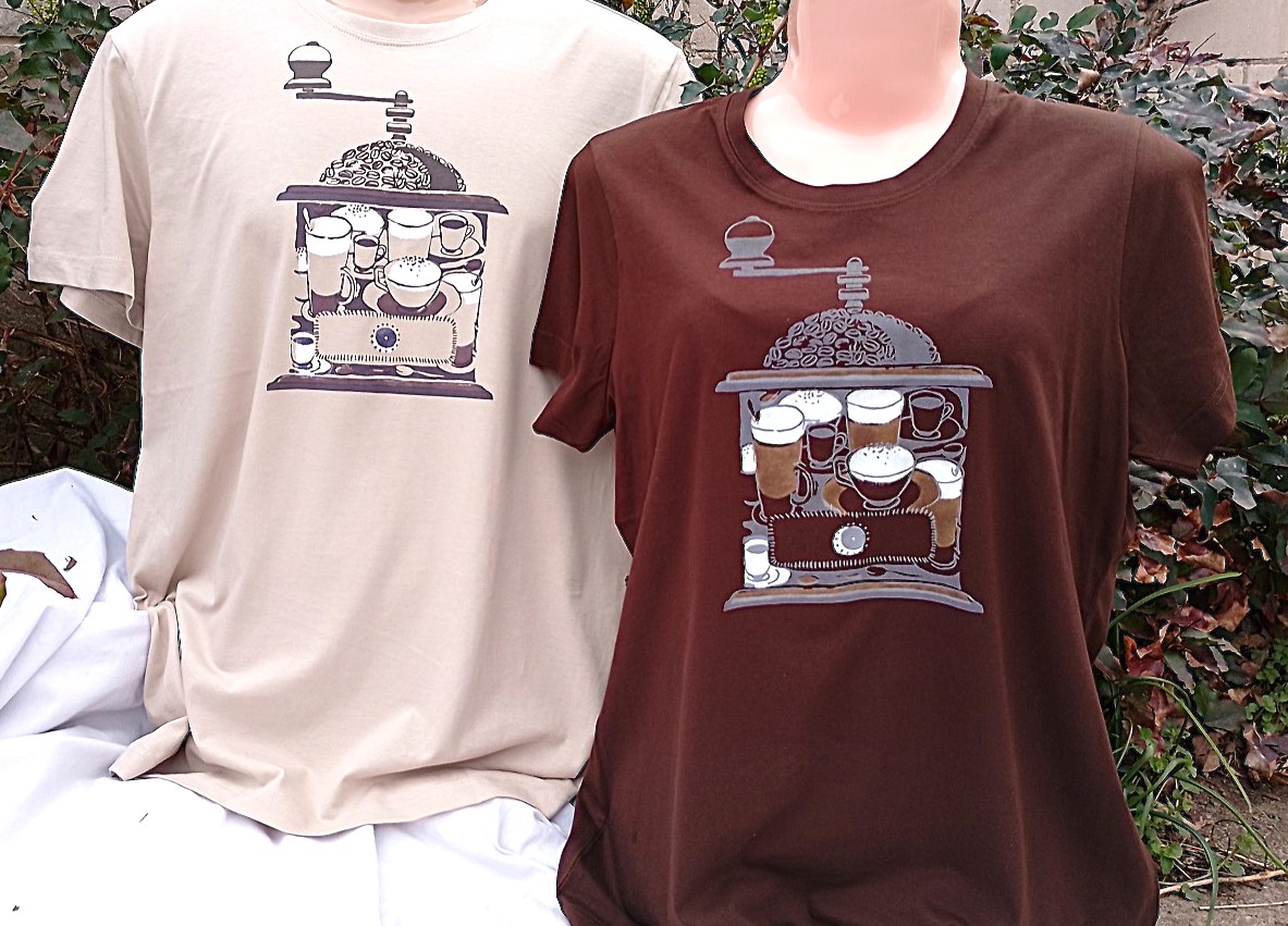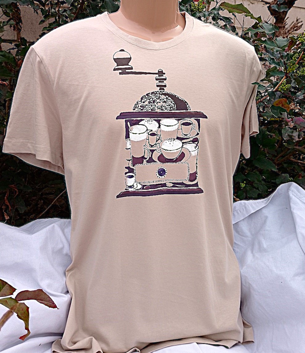 Tričko s motivem kafemlýnku, má barvu ledové kávy a rovný střih, který mohou nosit i ženy, co mají rády volnější věci.